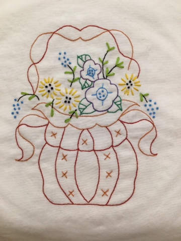 I bought this pattern a while back. After I finished the embroidery blocks from my flower garden quilt, I thought I wanted something to take it's place. They are cute little baskets, all different with a variety of flowers. The pattern sat there, as I got distracted with other hand work, but it did not turn out to be a waste.